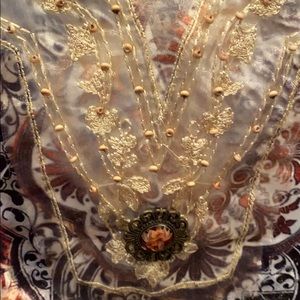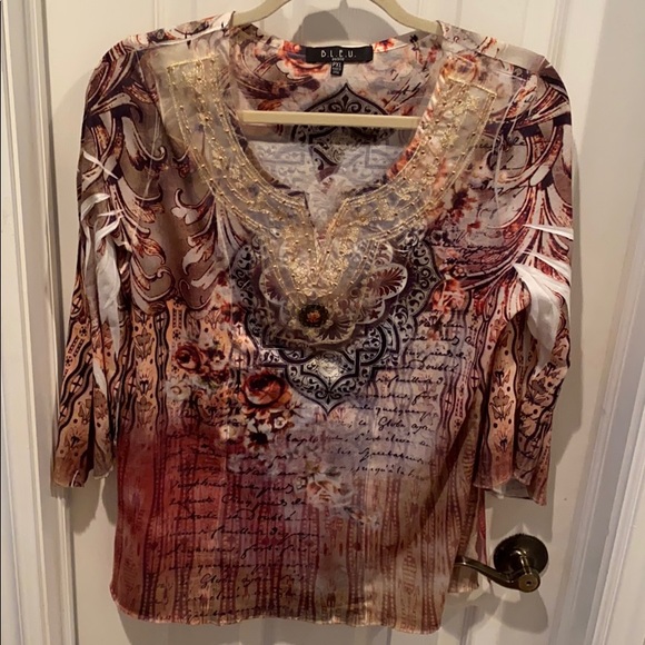 Velvety fabric tunic with beautiful print in bronze and brown. 3/4 length sleeves... lace on front with large crystal stone