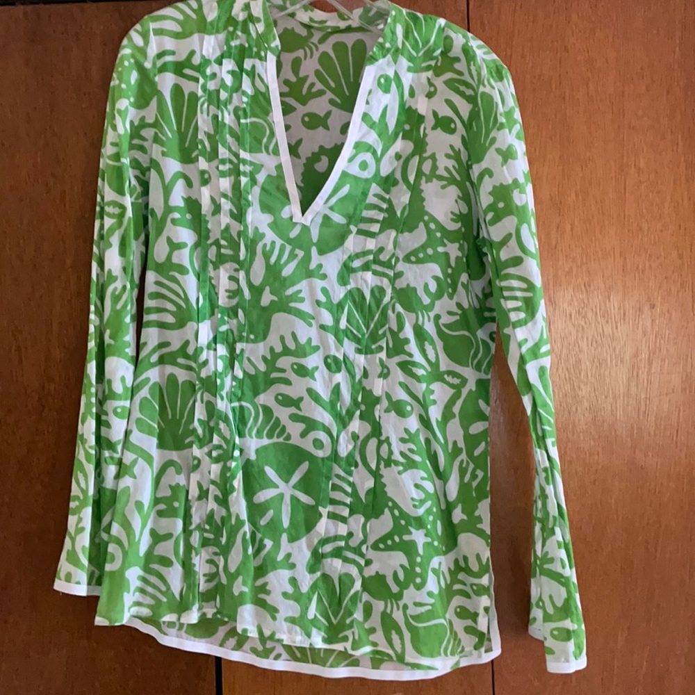 Green & White Beach Tunic or wear as a blouse. Pretty print Excellent Condition - 25 inches long - Shoulder to shoulder 15 inches