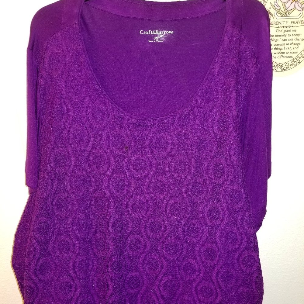 Beautiful deep rich purple tunic, round neckline, short sleeve with lace front, body lining is 95% Rayon, 5% Spandex. Size: 3x, 32" Length from shoulder to hemline.