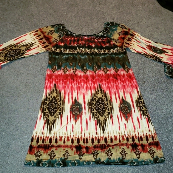 Beautiful jewel tone tunic. Dark blues,, reds, browns, cream. Long tunic or short dress. My absolute favorite! Long sleeves. Purchased from Farm Girls Fancy Frills Boutique. No-wrinkle stretch fabric.