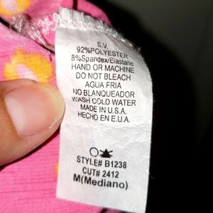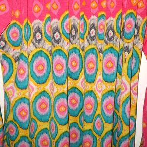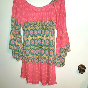 Tunic in no-wrinkle stretch fabric. Colors on Pink, aqua, yellow with bell sleeves. Purchased from Farm Girls Fancy Frills Boutique. Never worn. Can be long tunic or short dress.