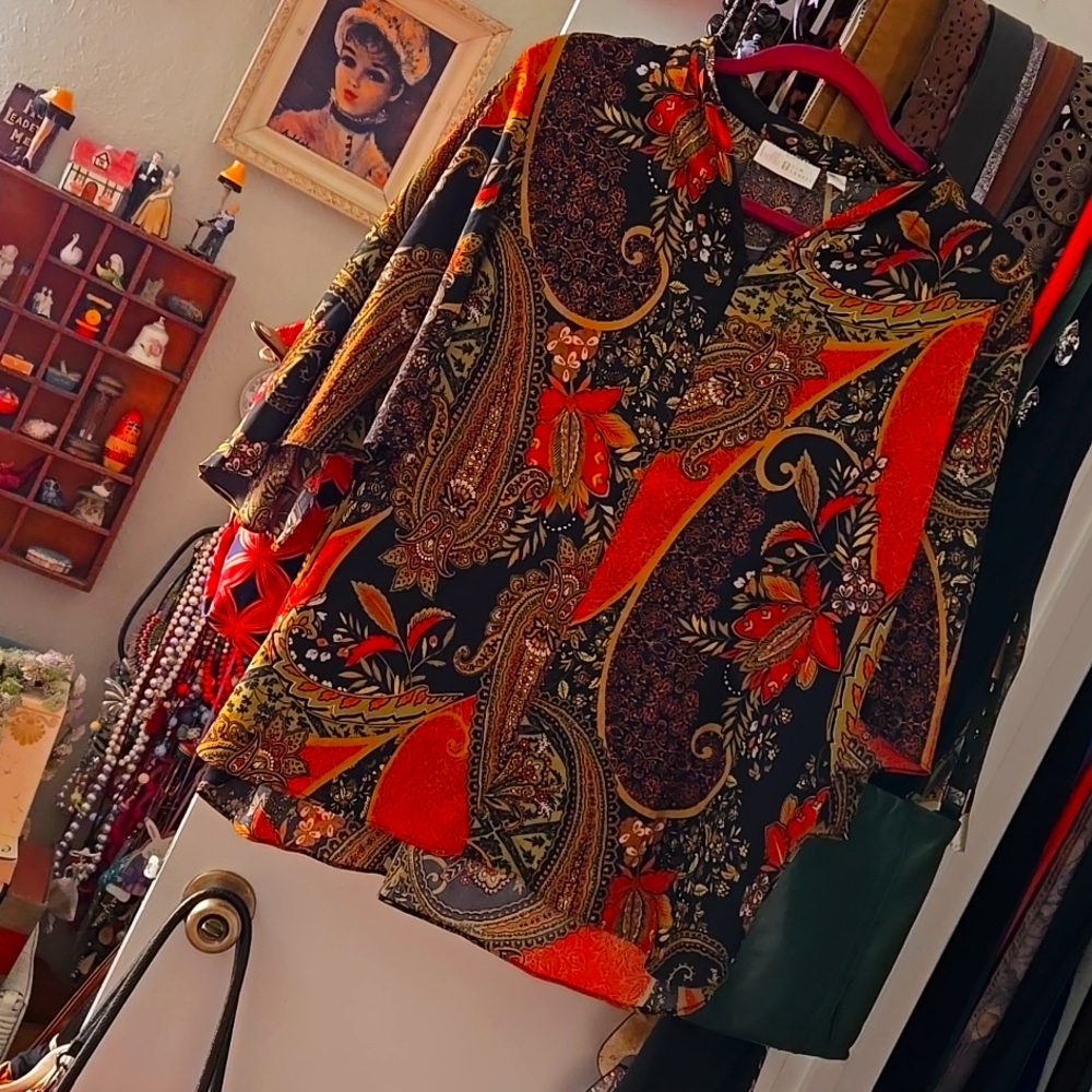 Very lightweight tunic, zips halfway down the front, bell sleeve slightly past elbow, and little longer in the back then the front but covers the tail