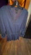 Tropical weight 100% pinstriped cotton top has a drawstring waist, roll up button strap sleeves, vented sides. fancy mandarin V neck has grosgrain ribbon detail.