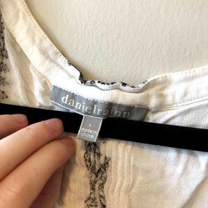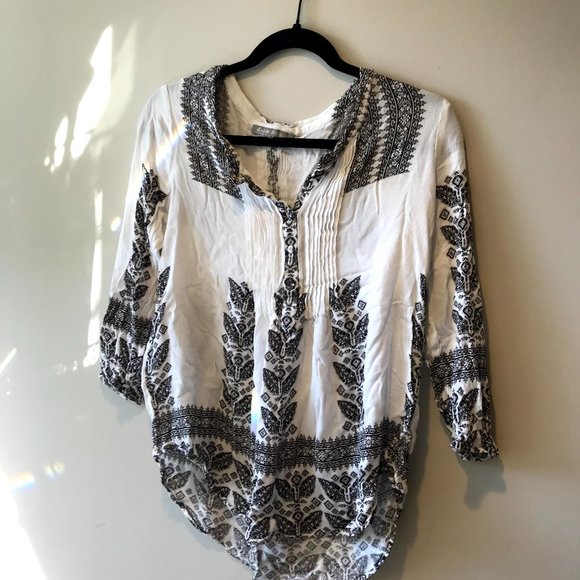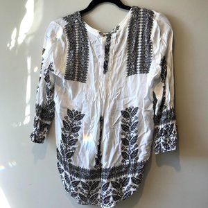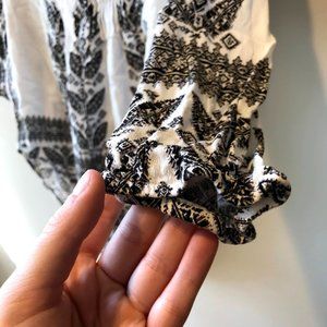 Tunic style top with black and white pattern and elastic banding on end of sleeves.