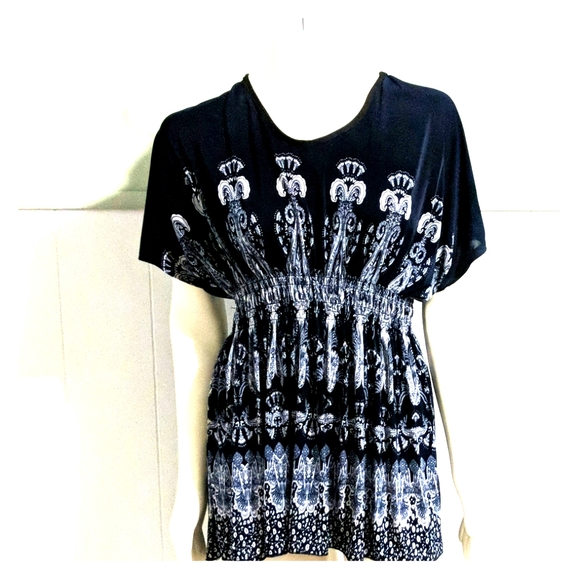 This navy blue tunic top is versatile and looks great with any kind of form fitting pant. The polyester and spandex combination material gives this shirt a unique look that doesn't fade.