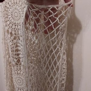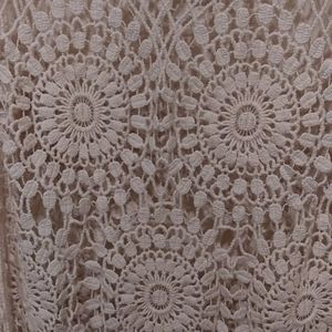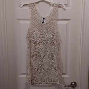 Cream/beige crochet tunic top with sunburst/floral design and "fishnet" criss-cross side design. GUC. No rips, tears or snags in material.