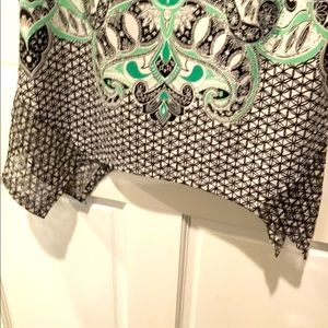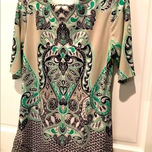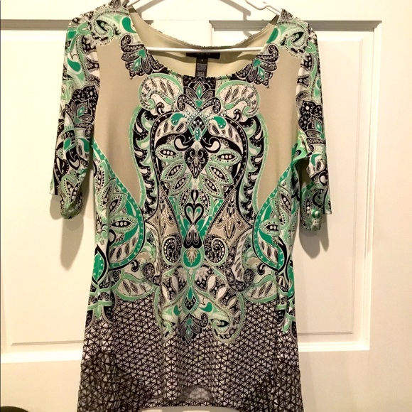 Style & Co short sleeve, stretchy, geometric top. Pretty with leggings. Neckline has silver sparkly embellished design. Fits more like a M