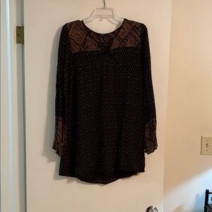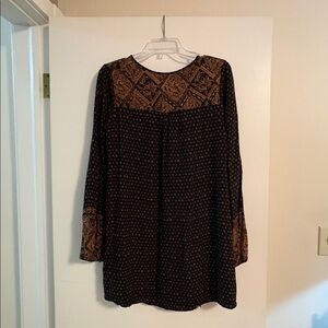 •Lightweight long-sleeve, lined tunic with beautiful all-over print. Black/brown contrasting print on yoke and cuffs.