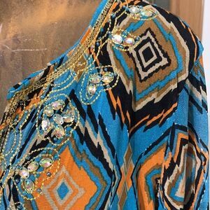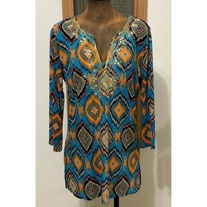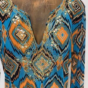 boho tunic top, geometric print, multicolor diamond pattern, turquoise blue, orange, black, yellow, v-neckline, beaded embroidery, long sleeves, lightweight fabric, casual, ethnic-inspired, festival style, statement blouse, relaxed fit, artistic design, unique pattern, chic bohemian look