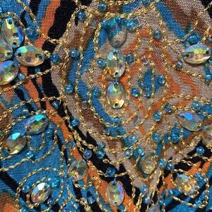 Iridescent beading and embroidery along the neckline and up to the collar bone