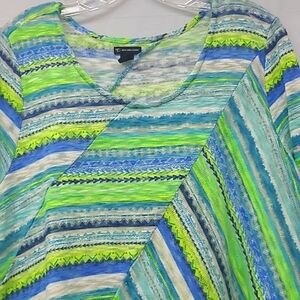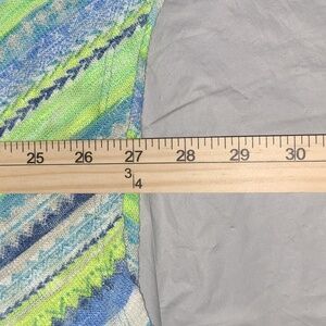 Tunic Top Patchwork Knit Blue Neon Green White Hankercheif Hem Elbow Sleeves