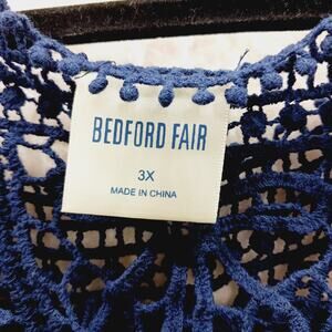 Timeless and romantic, this Bedford Fair crochet tunic blends delicate texture with wearable structure. Done in deep navy blue, this long-sleeve piece features a scoop neckline, semi-sheer sleeves, and a removable inner lining for customizable coverage. The detailed crochet pattern brings graceful movement and a handcrafted feel, making this plus-size 3X piece perfect for layered looks or standalone statement style.