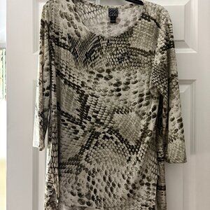Size large tunic style top with scoop neck. Measures pit to pit 21.5. Length measures 29 inches. Long sleeves. 70% polyesther, 20% rayon and 10% rayon. Washable in cold water. Condition is excellent.