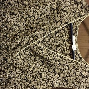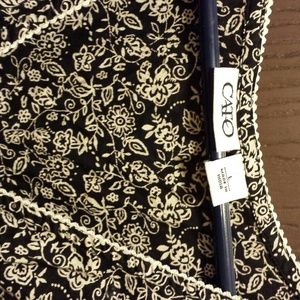 Black and white floral print; V neck; sleeveless; elastic cinching beneath breast line; Cato brand
