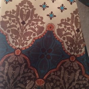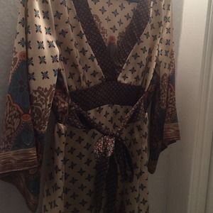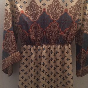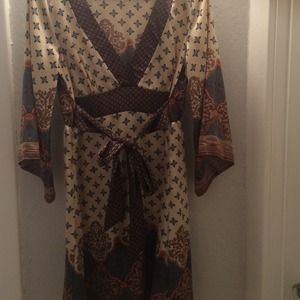 This is a silky material, v-neck dress. With an attached belt. It is a cream colored base with browns, blues and coral detailing.