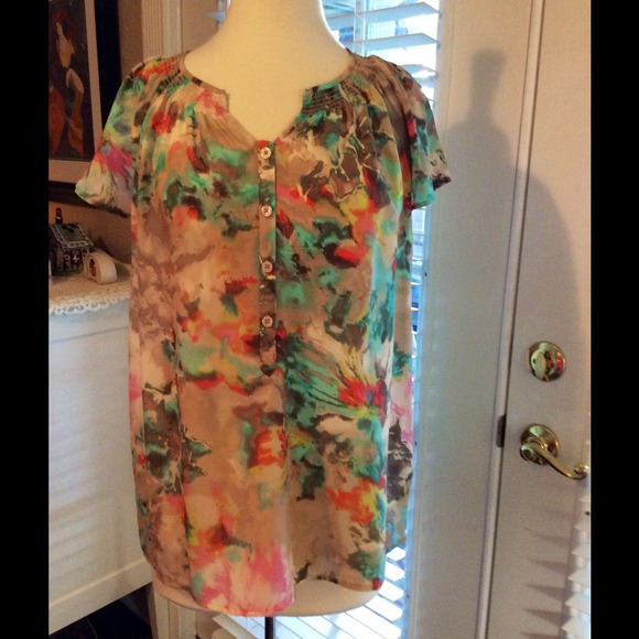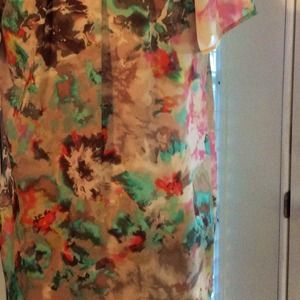 Soft silky button up top. Longer length. Pretty splashes of color in abstract design. New.