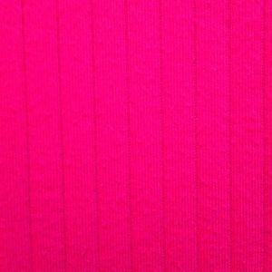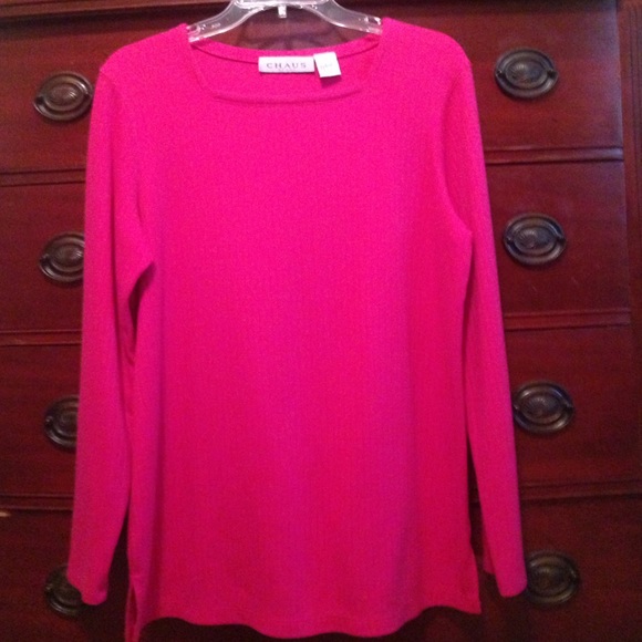 Long-sleeved, ribbed, fuchsia top. 62% polyester, 33% cotton, 5% spandex.