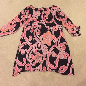 3/4 sleeves. Very comfortable! Great over leggings! Excellent condition! Only worn twice.