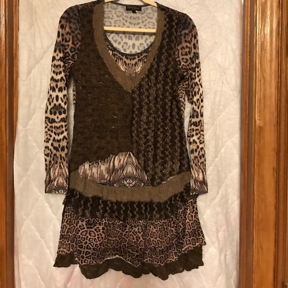 Charming animal-print tunic top with crochet lace and sequin detail, worn once or twice