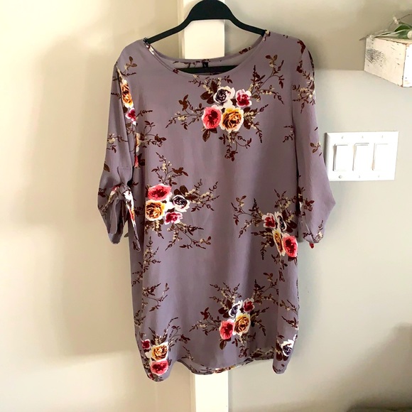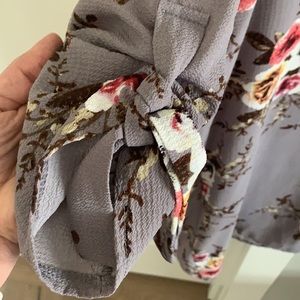 Feminine flowered (taupe, with a lavender hue), tunic. Tied up sleeves and will be adorable with your leggings.