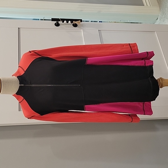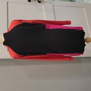 Multi-colored tunic top with stand-up collar and front 3/4 zipper. Front pocket pouch. Black, orange and fuschia.