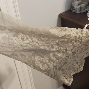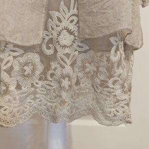 A Feratelli light khaki, lined top with lace/embroidery on sleeves and and underlay. There is a sheer overlay with back slit. Worn once. 100% polyester.