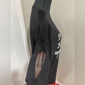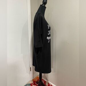 Super Comfortable Tunic/Dress. This Tunic/Dress has Pockets on Each Side, 3/4 Sleeve length with Netted Line in the Center and Fun Beaded Writing in the Front.