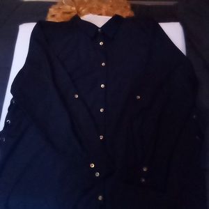 39 inch long tunic/blouse, black very lightweight, gold buttons & gold grummets, splits on the sides with ties size 2X, NWOT