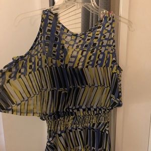 Printed shoulder tunic/top. Never wear! New with tag. Elastic under top (fits just right) yellow, black and white print.