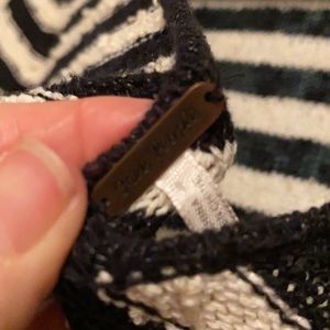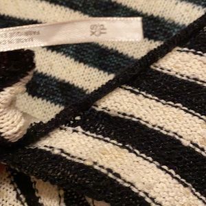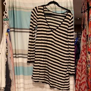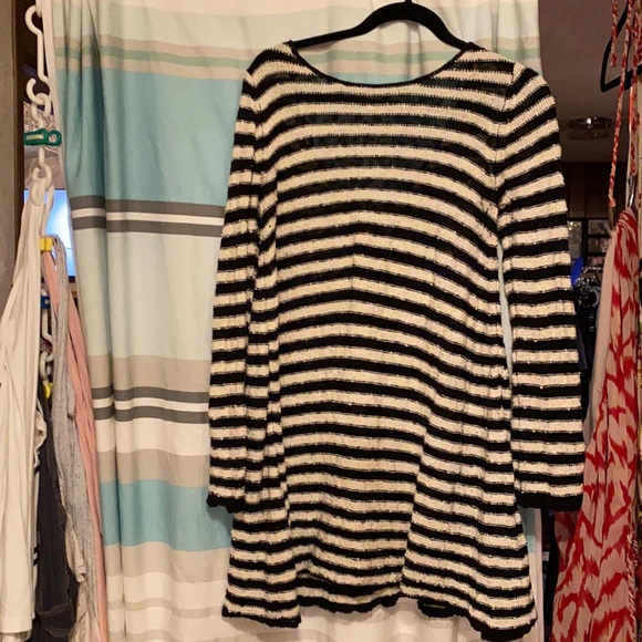 I have worn this a few ways with tights and boots, as a dress and boots both front which is full neckline and reversed it (because the tag didn’t bother me) and wore it as V neck. It’s an XS but I’m a medium and it fit is super cute gnarled sweater material. I’m not wearing it enough to keep it I got it for job attire but the length Of sleeves gets in the way professional speaking (I massage doing mani/pedi). So this gem is yours for the taking.