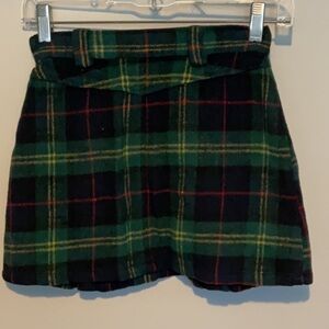 Tunnel Vision Weetzie green plaid skirt. Soft plaid mini with front zip pleats to expose more plaid extending to add some flare to the skirt. D-ring at waist. Button and zipper fly.