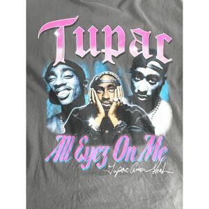 Official licensed Tupac “All Eyez On Me” graphic t-shirt. Features large front print with 3 portraits of Tupac in pink/blue tones and bold logo text.