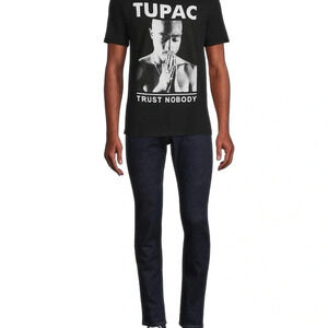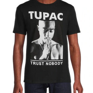 Tupac Men's Trust Nobody T-Shirt with Short Sleeves Show your fandom and love for hip hop with this Tupac Shakur Graphic Tee. Crafted in comfortable, breathable cotton with a classic crewneck and short sleeves, this menâs T-shirt easily earns a spot on the graphic tee rotation. Pair it with jeans, joggers or shorts and lace up your favorite sneakers for a cool-casual day ahead. Material:Â 100% Cotton
