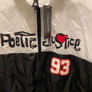 Stylish black and white jacket with Poetic Justice logo and red accents. Features a bold '93' design.