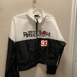 Stylish black and white jacket with Poetic Justice logo and red accents. Features a bold '93' design.