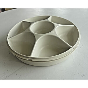 The Tupperware 1665-1 Divided Serving Tray Container is a vintage kitchen collectible featuring a round shape with a pop-off lid. This large tray has more than 5 compartments, making it perfect for organizing and storing various items in the kitchen. The beige color and Tupperware branding add a touch of retro charm to your home decor. With its original design and practical features, this tray container with lid is a must-have for collectors and those looking for unique storage solutions.