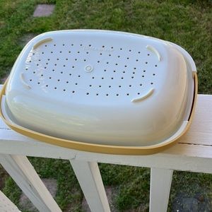 In great condition, one set of Vintage Tupperware Vegetable/Rice White Steamer Insert with Harvest Gold Lid #1273-6