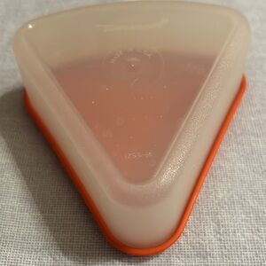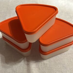 Eight storage pieces of Tupperware all with seals on. Five triangle shaped pi keepers with seal 1799–14, 1800–9. One square container 670–32, 671–30. One condiment dispenser with two different openings. 846–1 5, 1845-11. Larger poor condiment container with three different styles of openings, 1650–4 1632–5. Only one piece has ever been used. Tupperware has a lifetime warranty against cracking breaking peeling.
