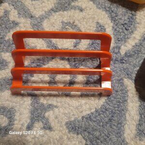 Tupperware, double spoon rest brown, orange scoop, orange pie server, yellow soap dish, yellow hard boiled egg scoop, orange letter holder, and orange cheese cutter.