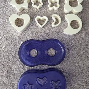 Durable Tupperware cookie cutter set. Includes star, heart, moon, and flower shapes. Perfect for baking fun.