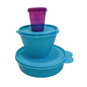 Tupperware bowl set with lids includes a purple 2 oz. Midget, blue 4 oz. Refrigerator bowl, and blue 10 oz. Big Wonder bowl. Perfect for storing small portions, leftovers, or meal prepping. Durable and lightweight, these bowls are ideal for kitchen organization or on-the-go use. The secure lids help keep food fresh. Brand new set, never used. Great for home, office, or lunch packing. Classic Tupperware quality in a convenient size.