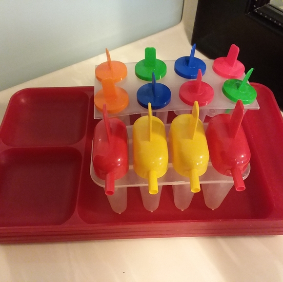 4 Tupperware trays and 2 popsicle makers. 2 Cups. One tray has a few scratches. Two cups one have a few marks.