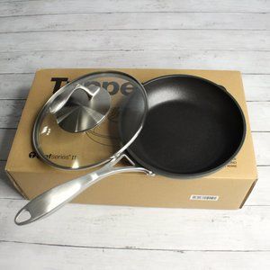 This Chef Series non-stick skillet is made of stainless steel with hard-anodized aluminum with anti-stick coating. It is covered and includes a stainless steel glass lid. The set is extremely nice quality and is brand new in box. Please know the pan was removed from the box in order to take photos. The original box is included however the box shows some wear.