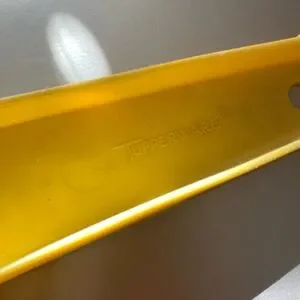 Bright yellow plastic strainer. Durable lightweight design. Easy-grip handles for steady use. Snap-in basket with fine square holes for draining.