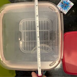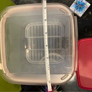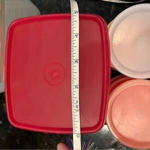 Brighten up your kitchen with this colorful Tupperware brand storage container set. Perfect for organizing and storing food. Includes vibrant orange and blue containers. See pics for measurements of two of the larger Tupperware storage containers. Perfect for food storage in your kitchen or for on the go. See pics for measurements. Extra lids are included.