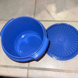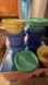 Bright Tupperware bowls in blue, teal, and yellow. Ideal for organizing your kitchen.