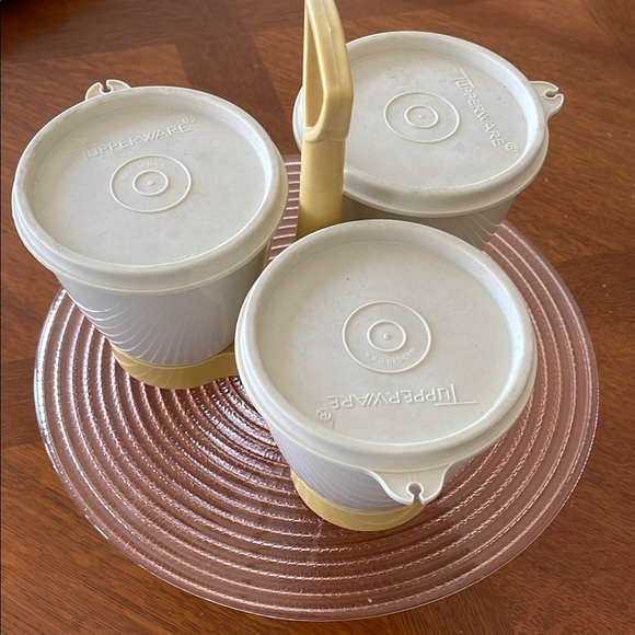 Vintage condiment set from Tupperware features three lidded containers that fit snugly into the base. Perfect for storing and serving. Each cup has a generous 10 ounce capacity.