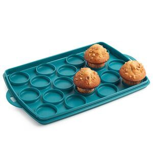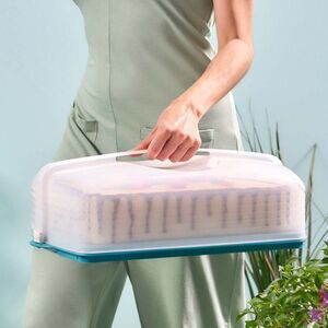 Our Rectangular Cake Taker can hold a single- or double-layer cake up to 9 x 13 inches/23 x 33 cm big, or its tray can flip to hold up to 18 standard cupcakes in their own little wells.
