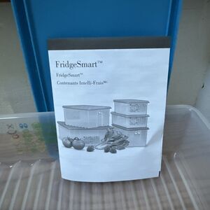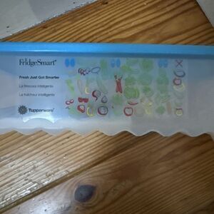 Brand new Tupperware fridge, smart kitchen storage system. Dual vents for optimal, freshness of your fruits and veggies. Easy to use visual diagram on the side helps you know which setting to use. Has a teal blue colorful lid. See photo for small floor, there is a scrape in one corner that does not affect the use of the product.