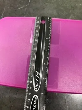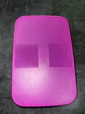 Compact plastic storage container with a bright pink lid. Durable and lightweight. Simple snap-top design. Great for organizing small items.